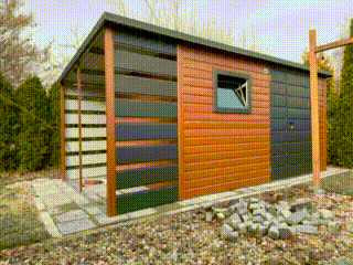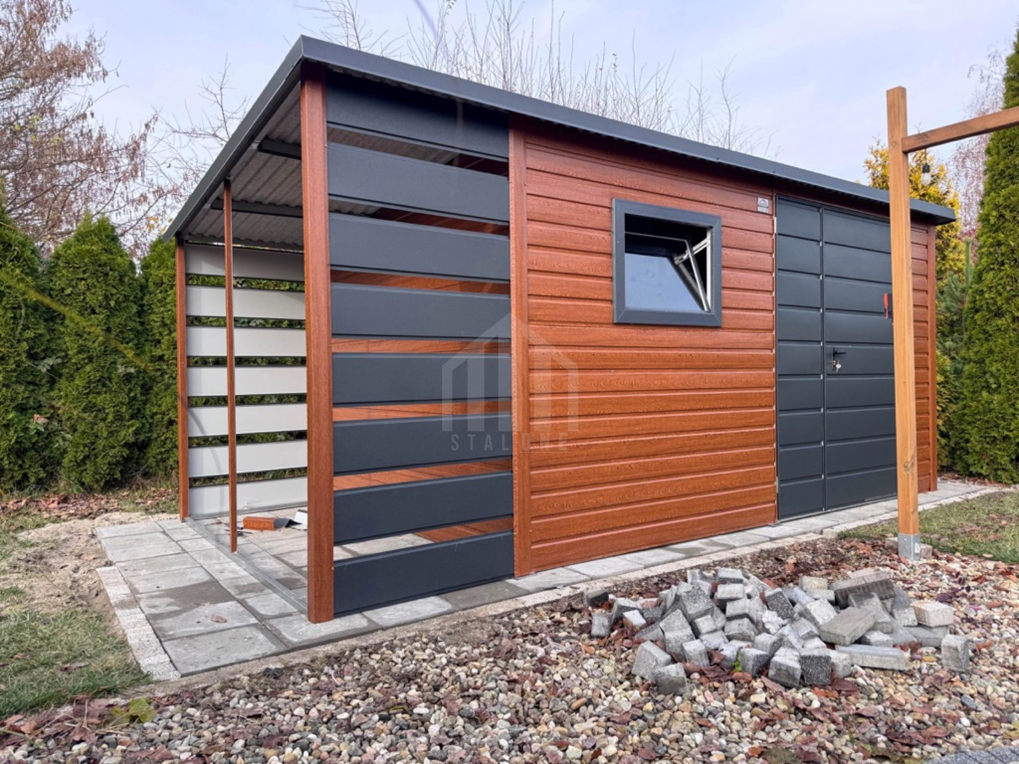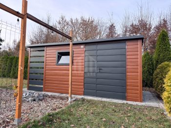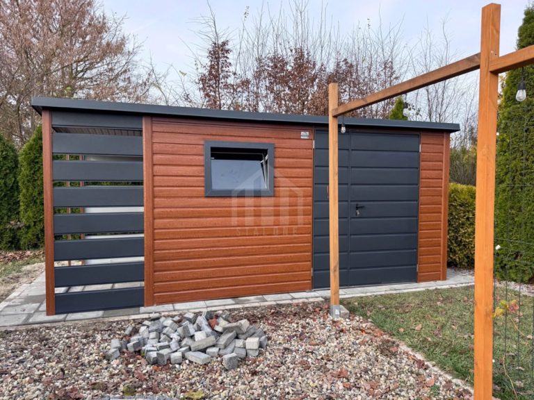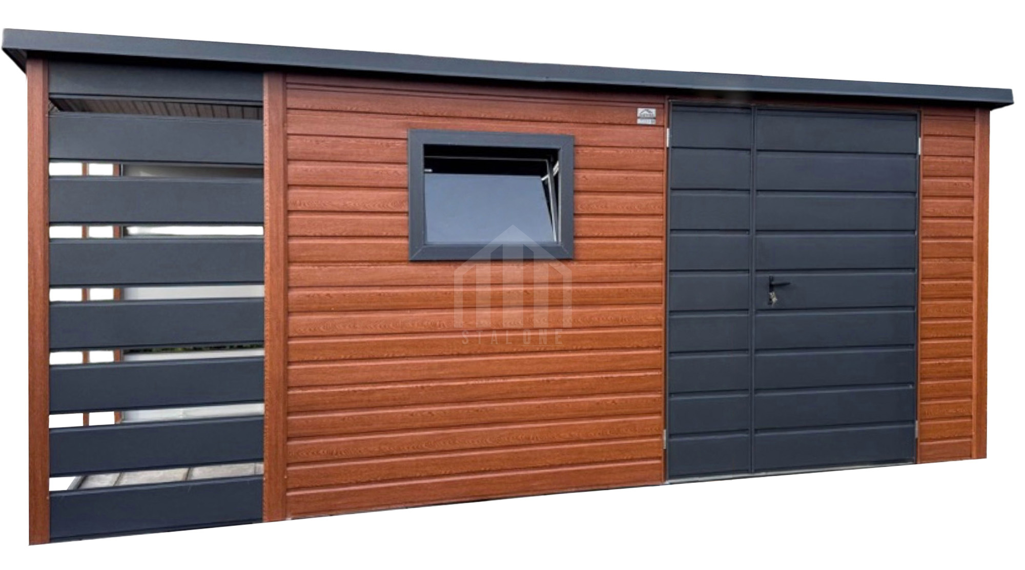 / Schowek – domek ogrodowy 3×2 m + wiata 1×2 m – drzwi – okno – drewnopodobny – dach spad w tył SO178
