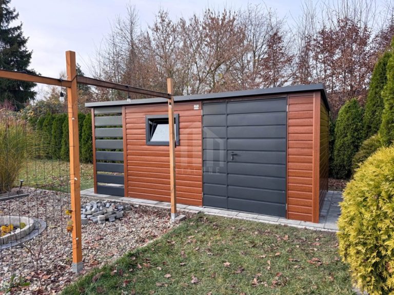 Schowek – domek ogrodowy 3×2 m + wiata 1×2 m – drzwi – okno – drewnopodobny – dach spad w tył SO178