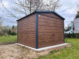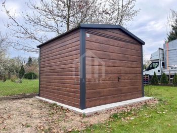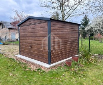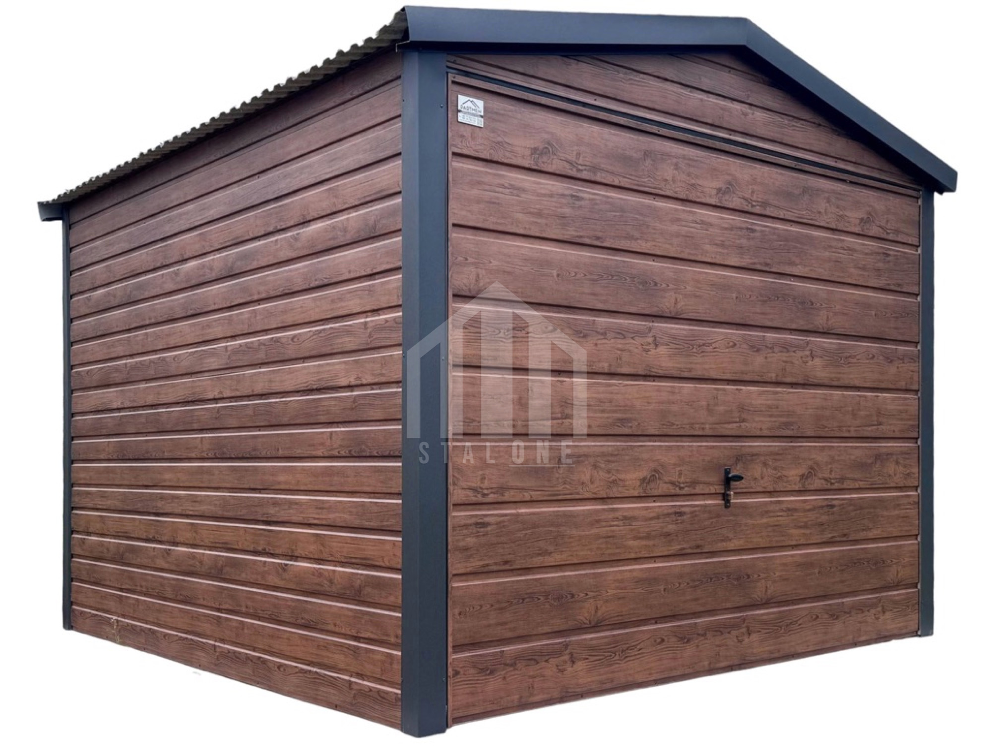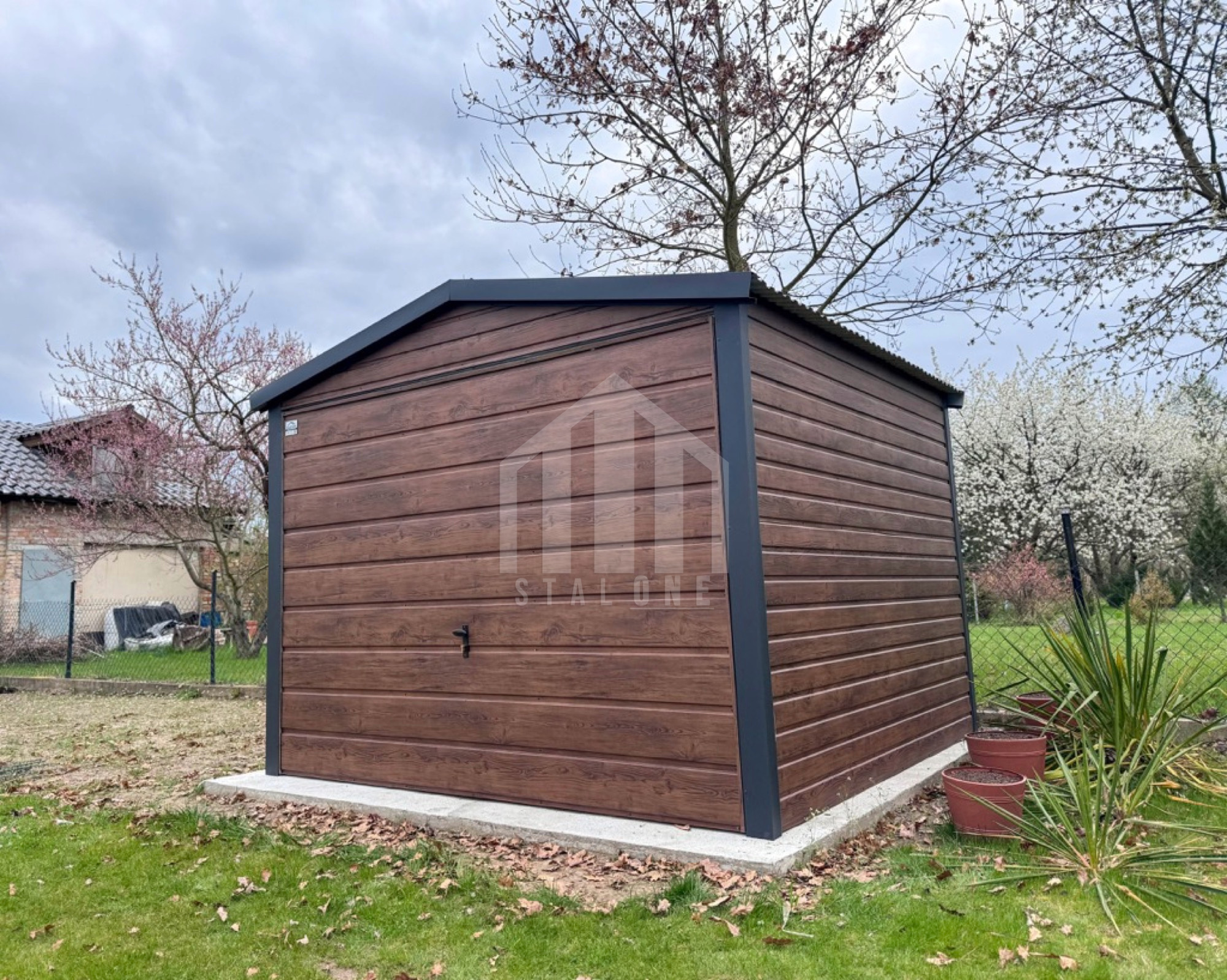 Garaż blaszany 3x3m – brama uchylna – ciemny orzech – drewnopodobny – dach dwuspadowy SO111