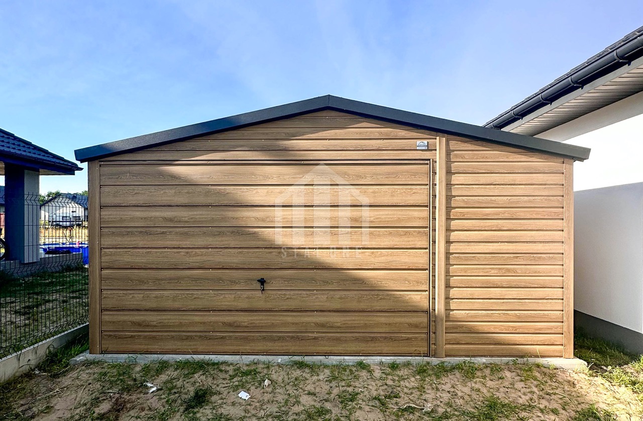 Garaż blaszany 4,5x5m – brama uchylna – drzwi – winchester – drewnopodobny – dach dwuspadowy – rynny SO115