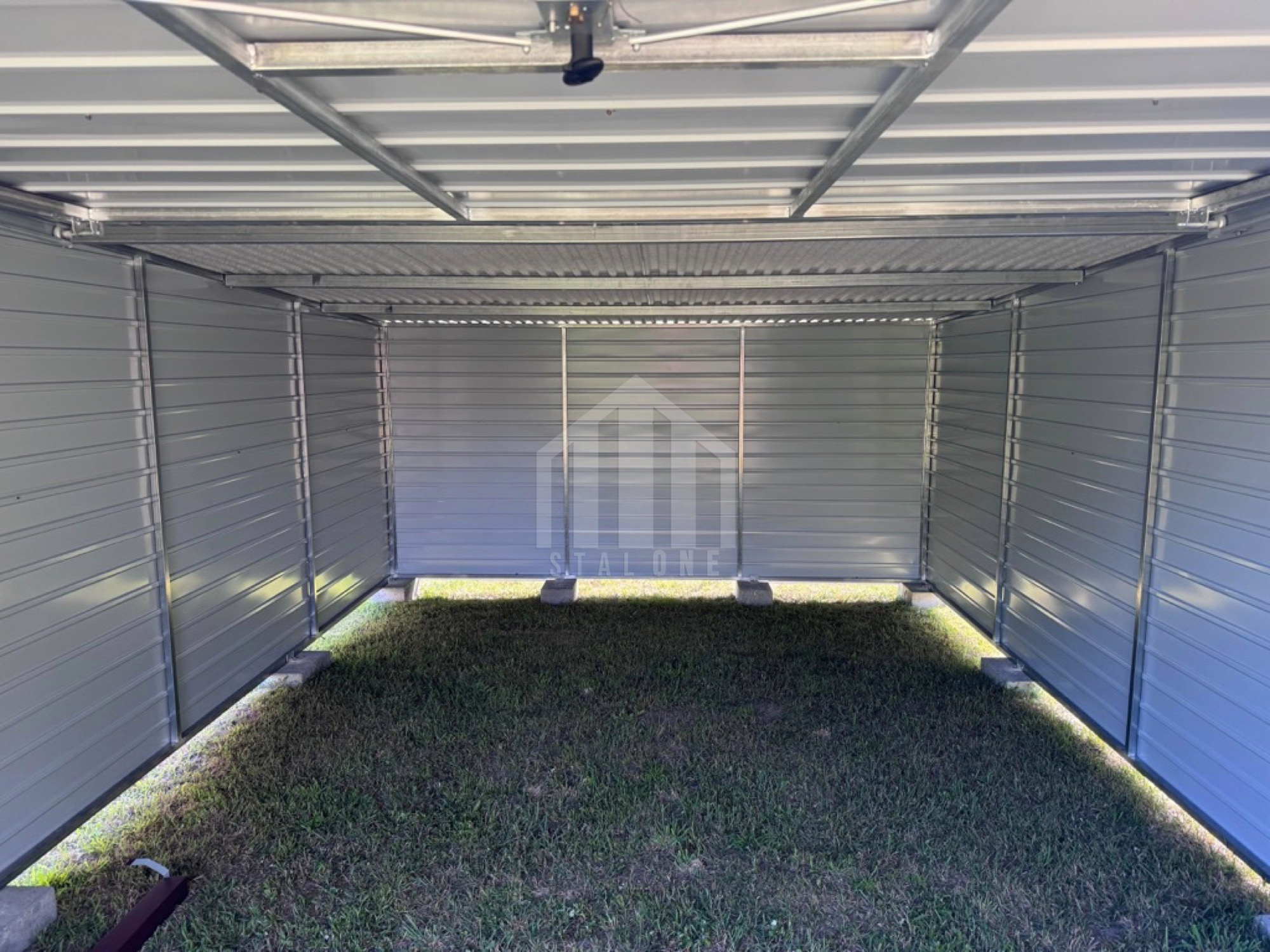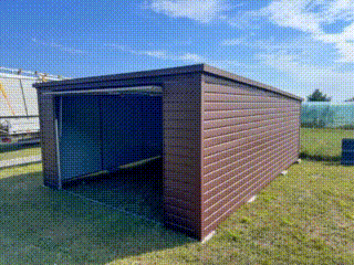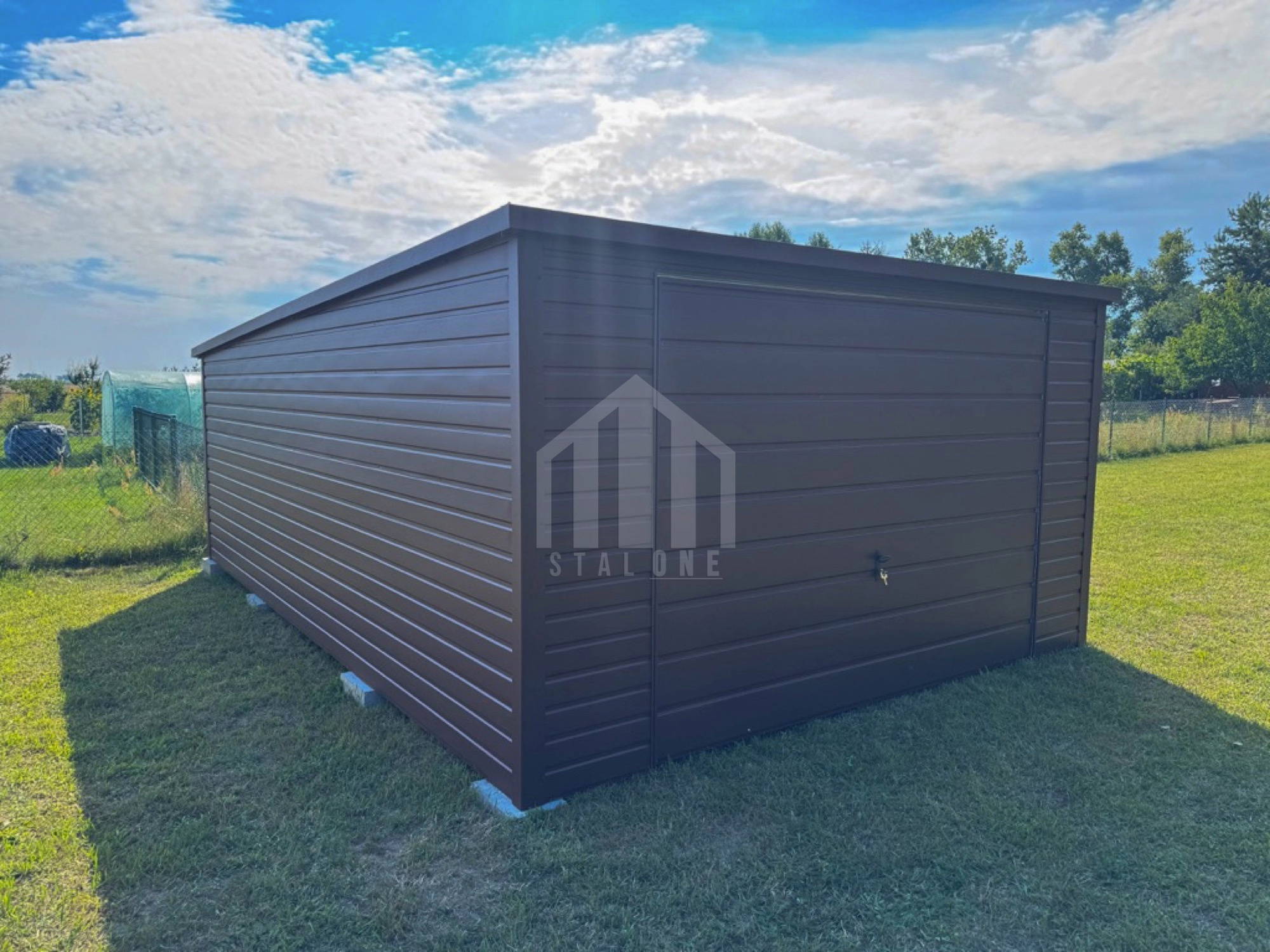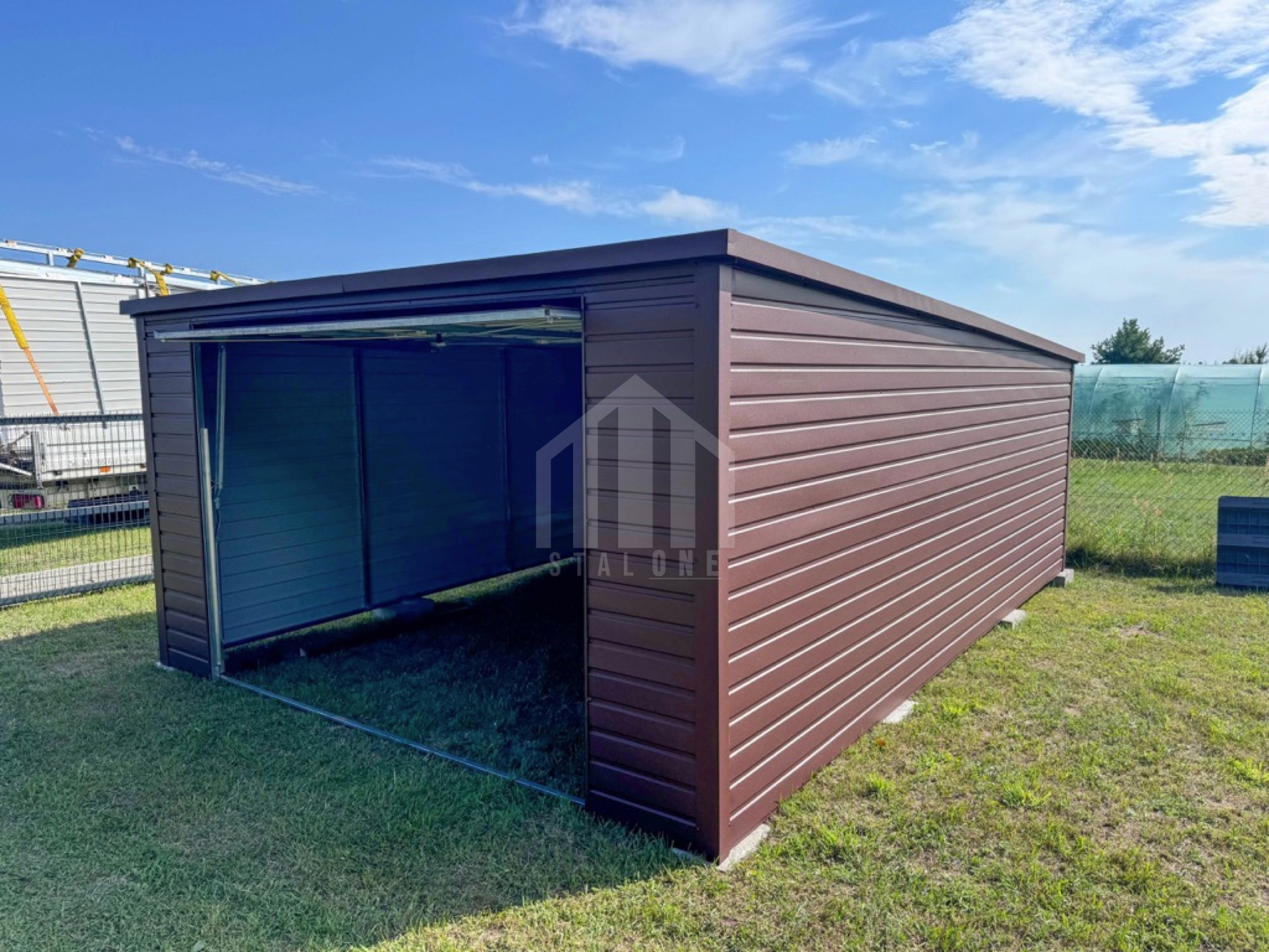 Garaż blaszany 4x5m – brama uchylna – ciemny brąz – dach spad w tył SO118