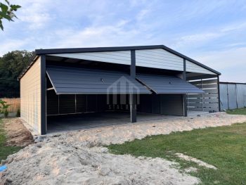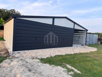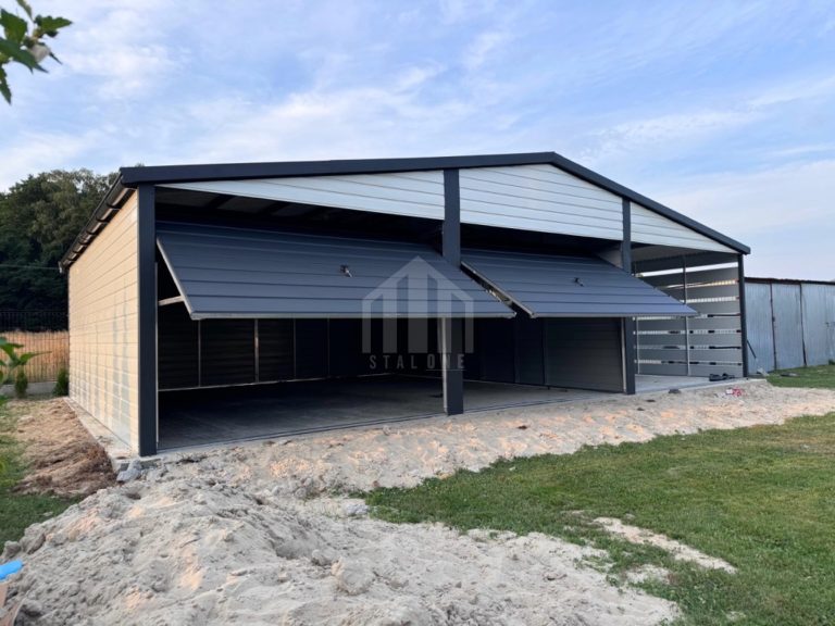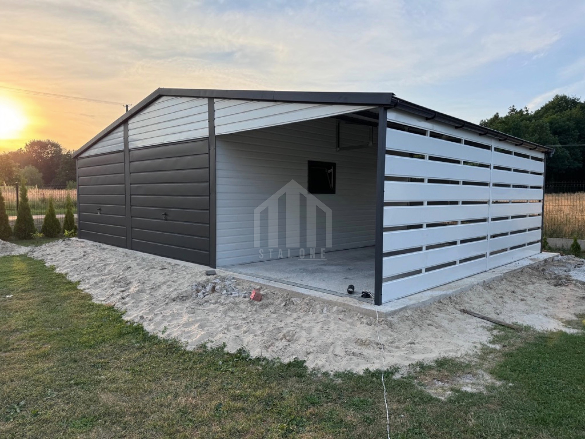 Garaż blaszany 6x5m + wiata 3m – 2x brama uchylna – okno – biały – dach dwuspadowy – rynny SO131