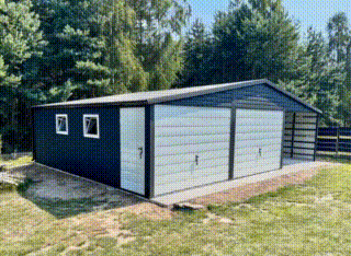 Garaż blaszany 6x6m + wiata 3m – 2x brama uchylna – drzwi – 2x okno – antracyt – biały – rynny – dach dwuspadowy SO105
